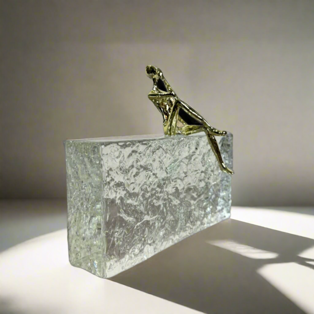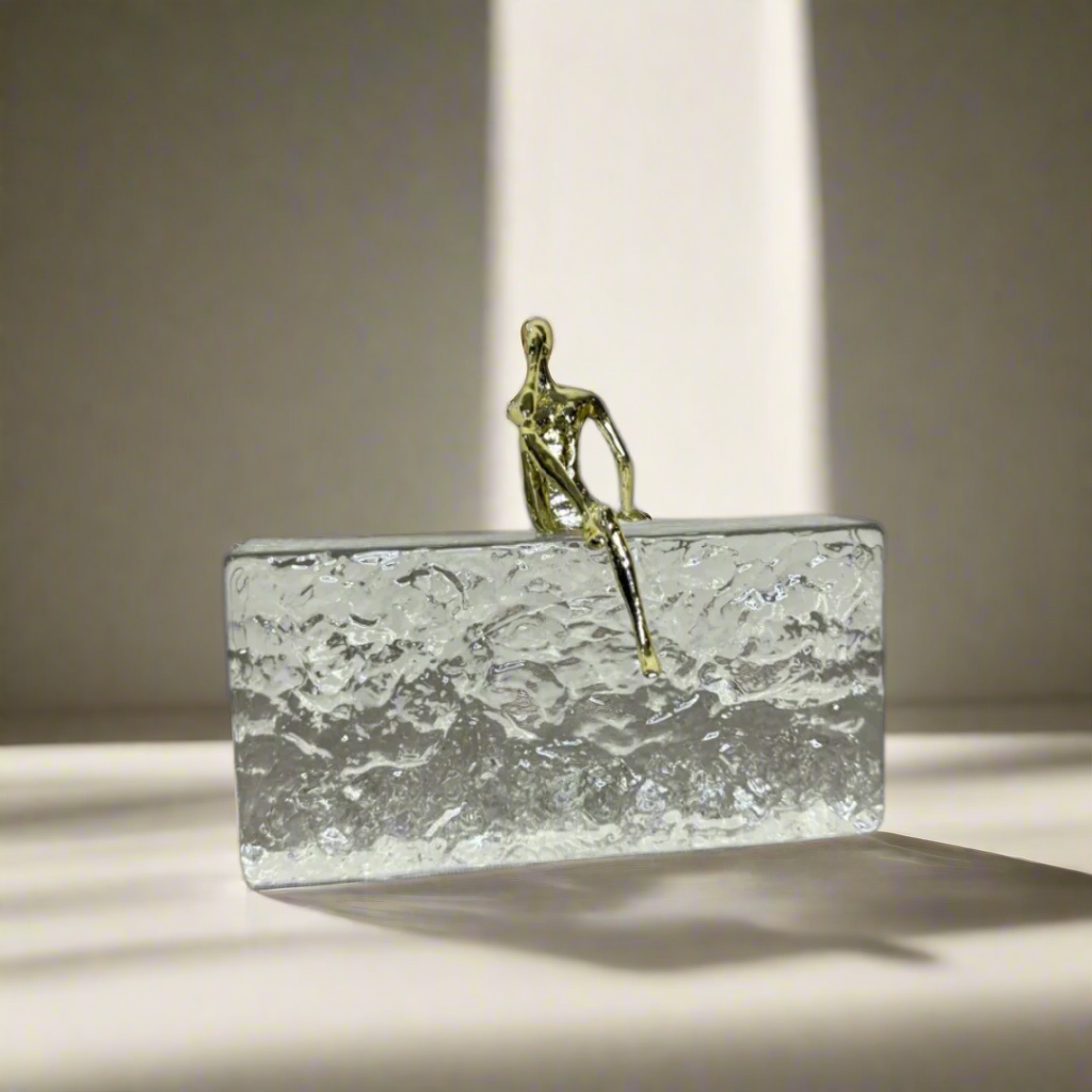 Elevate your holiday decorations with this stunning crystal ornament featuring a charming gold man sitting atop. This eye-catching piece adds elegance and charm to any tree or display. Brighten up your home this season with this unique ornament.