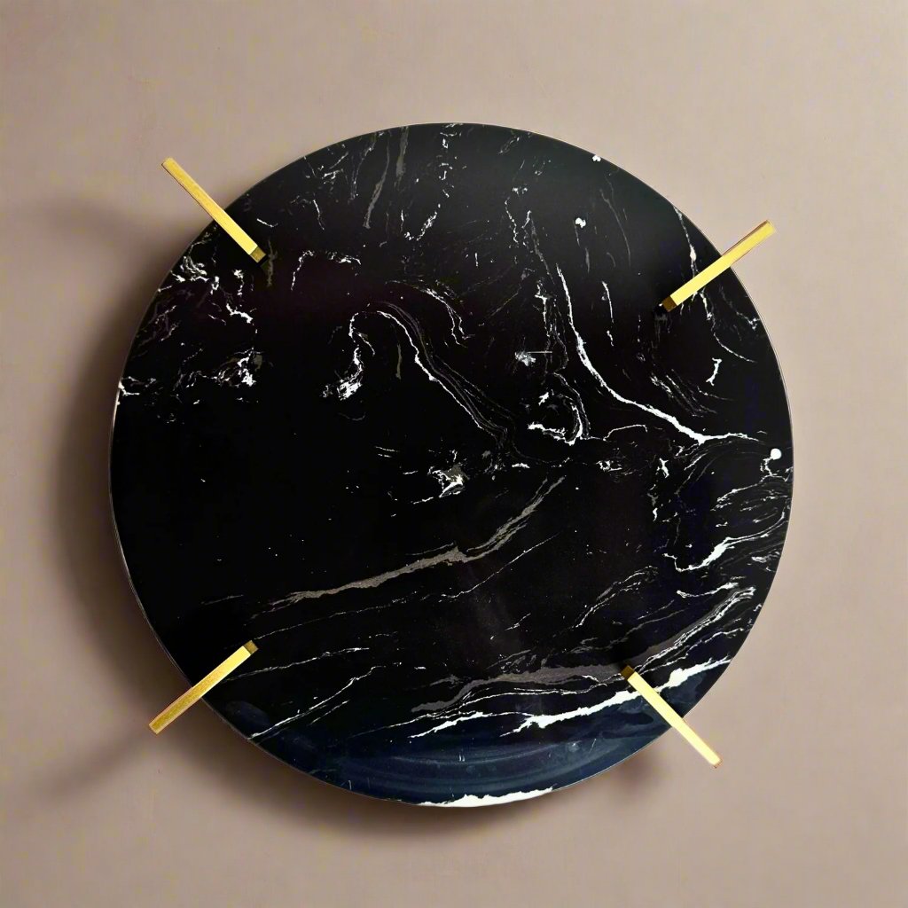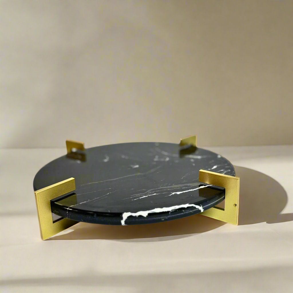 Simple and elegant, this marble tray with a metal stand adds a touch of sophistication to any space. The smooth surface and sturdy stand make it perfect for serving hors d'oeuvres or displaying home decor. Elevate any occasion with this versatile and stylish marble tray.