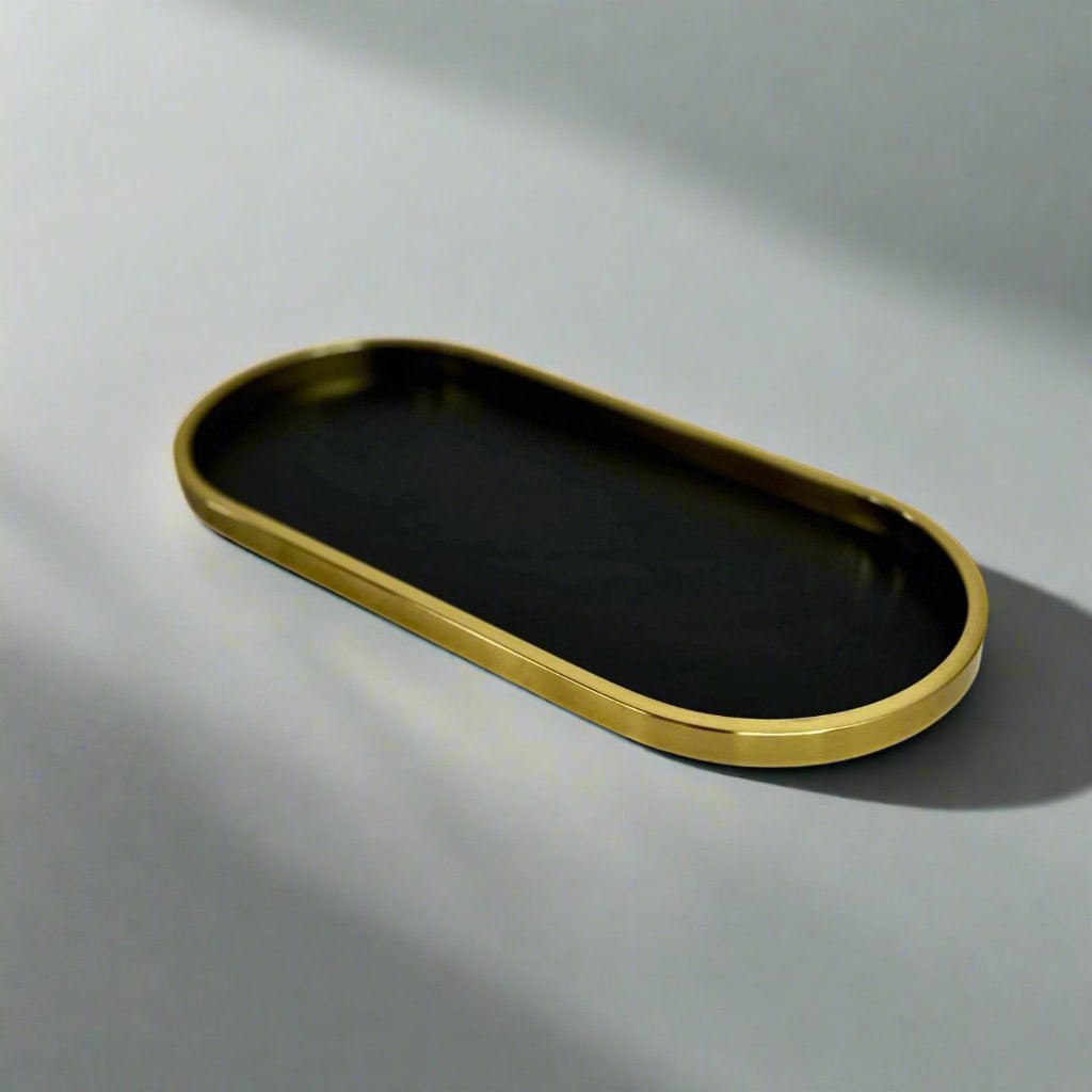 This sleek metal gold tray is the perfect addition to any home. Its black tray and gold casing add a touch of elegance while providing a sturdy surface for serving or displaying items. Add a touch of sophistication to your space with this tray.