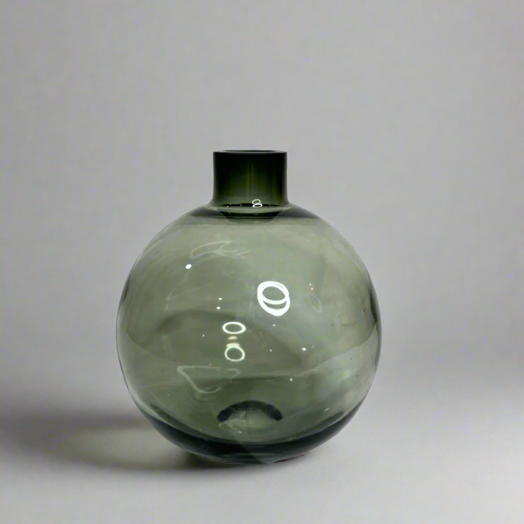 This round smoked glass vase adds a modern touch to any room. Its unique design and quality materials offer a sophisticated look and feel, perfect for displaying fresh flowers or greens. Elevate your home decor with this elegant vase.