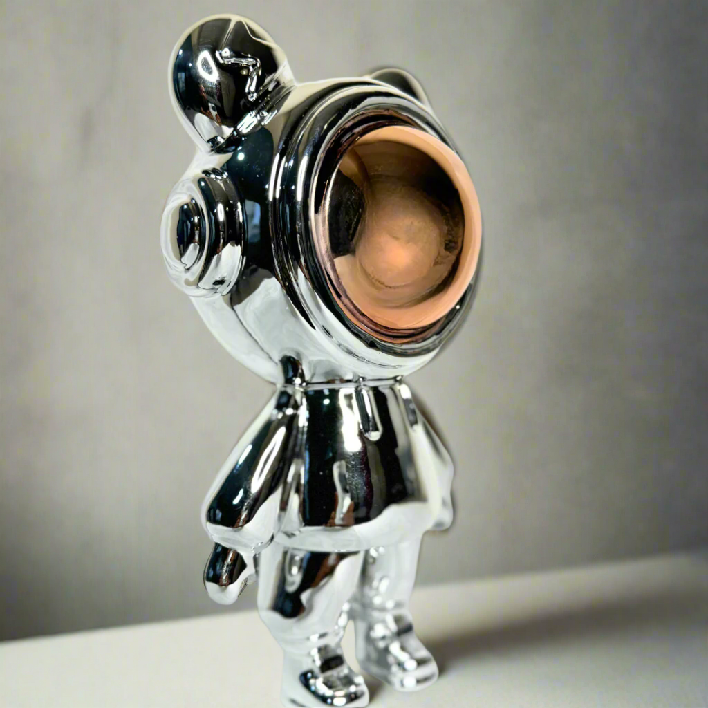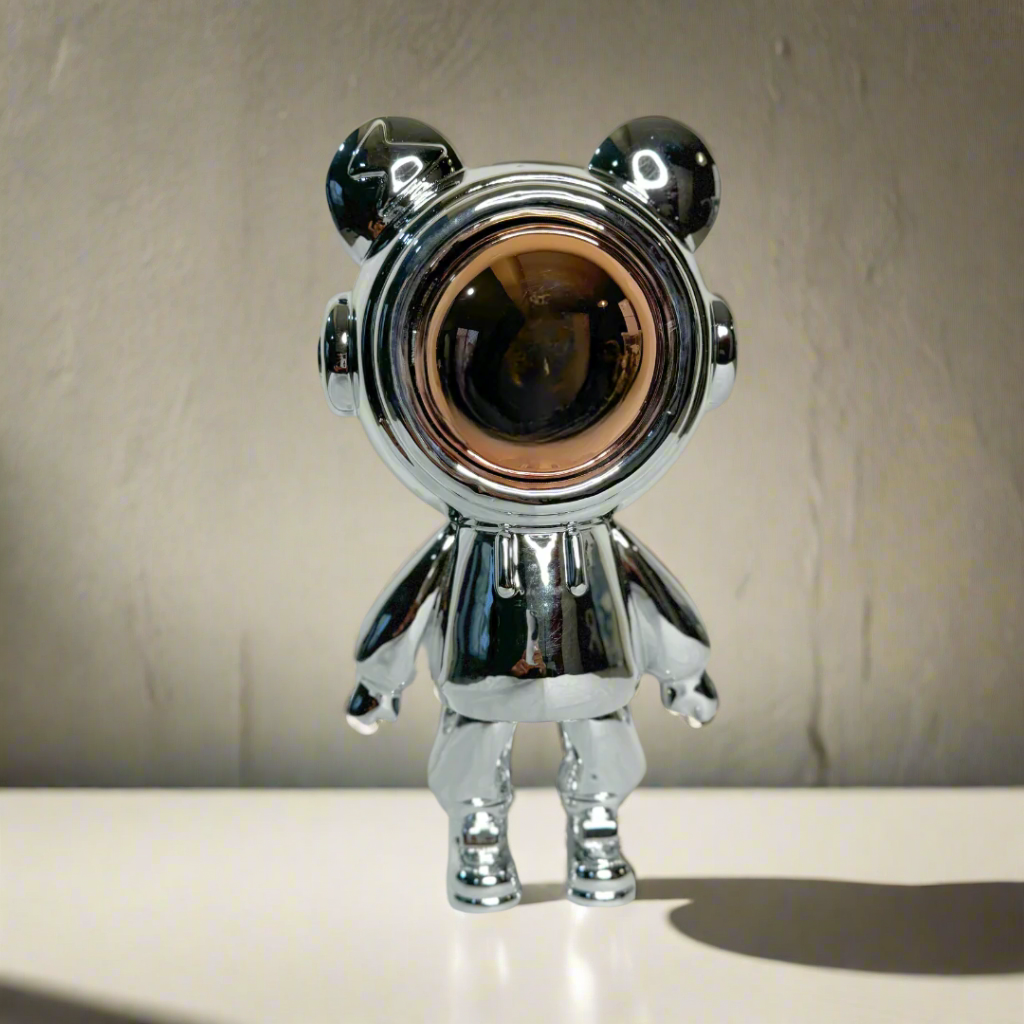 This silver space teddy is an out-of-this-world companion. Featuring a sleek silver design, it adds a cosmic touch to any room or collection. Perfect for anyone who loves fun and unique decor pieces.