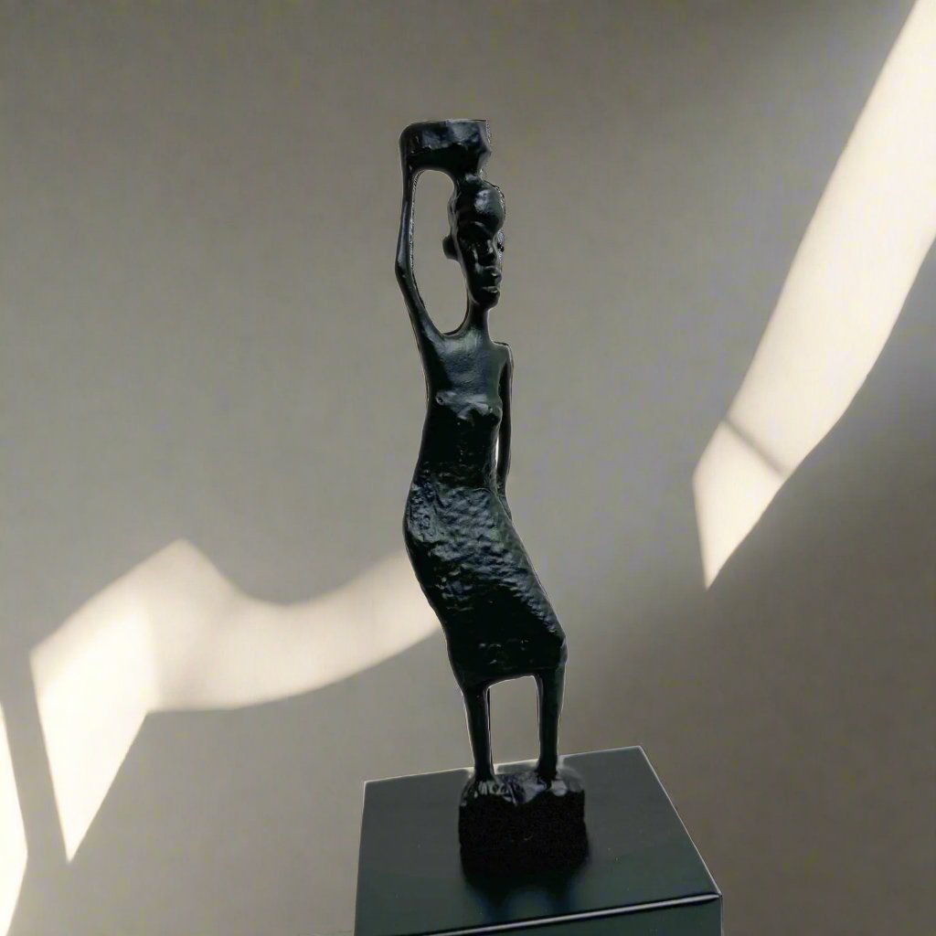 Elevate your living space with our elegant Woman Sculpture. This stunning piece features a woman gracefully holding a bucket on her head, adding a touch of sophistication to any room. Display it as a reminder of strength and determination, making it a perfect addition to your home decor.