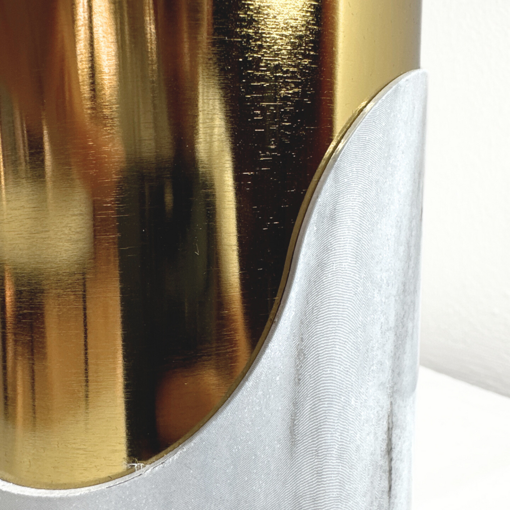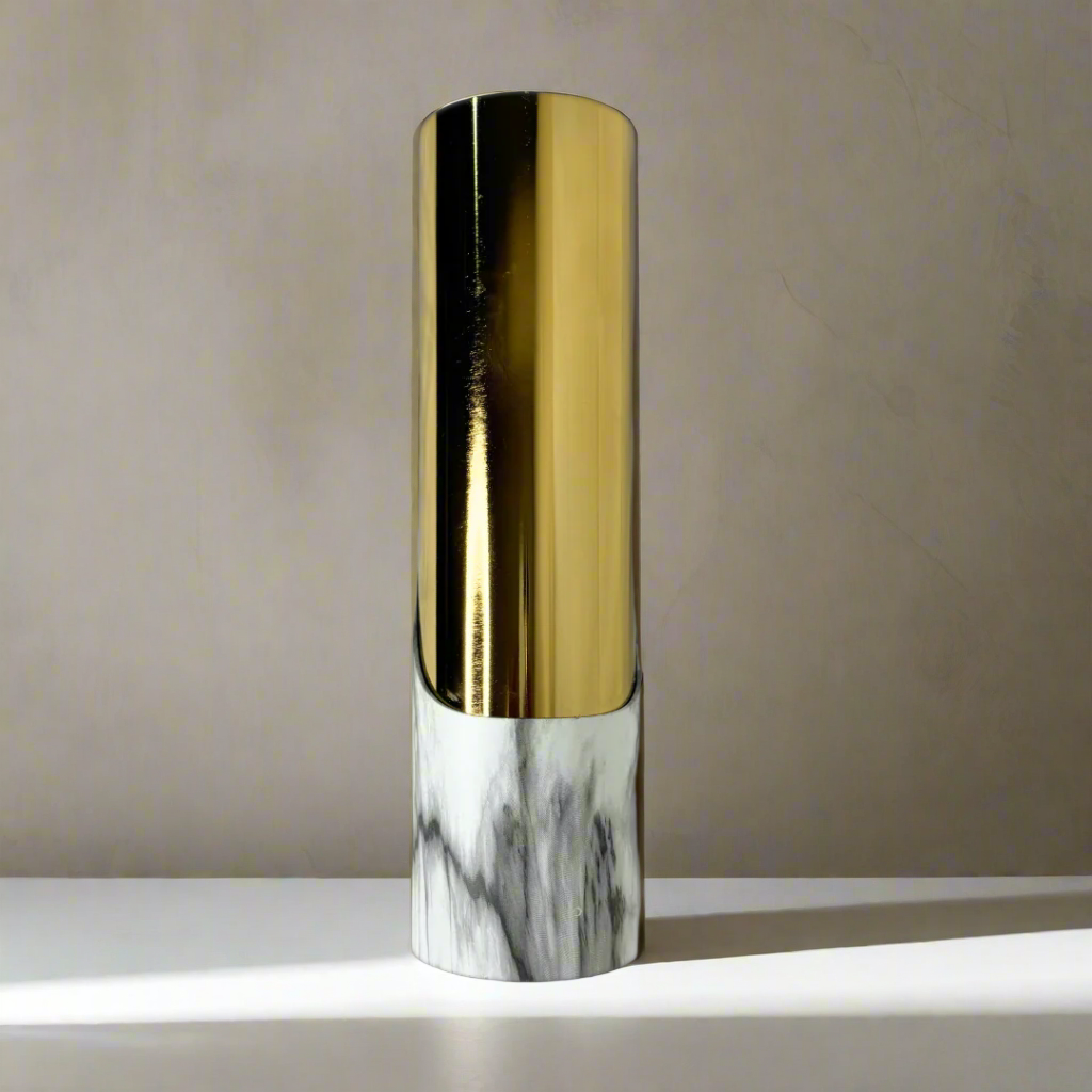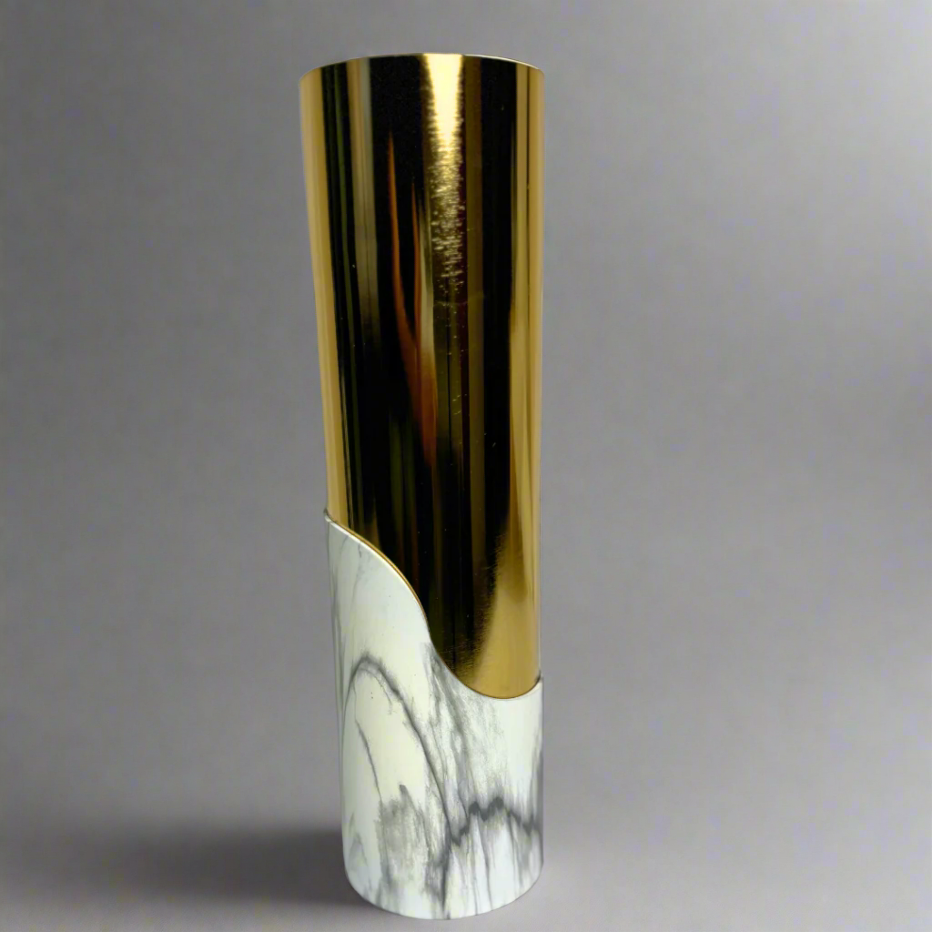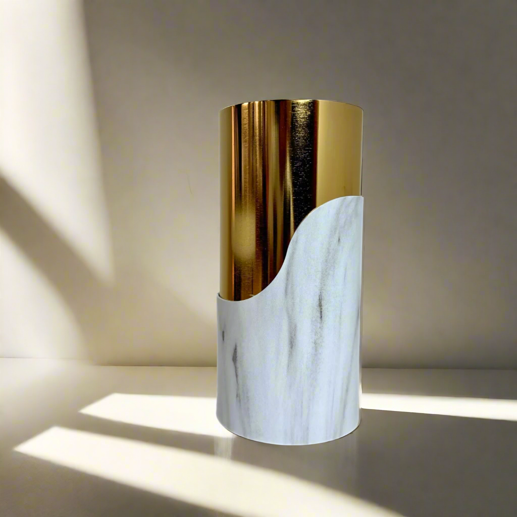 Stunning white and gold vase adds a touch of elegance to any room. Its sleek and versatile design complements any decor, making it a statement piece. Made with high-quality materials, this vase is not only beautiful but also durable. Elevate your space with this timeless centerpiece.
